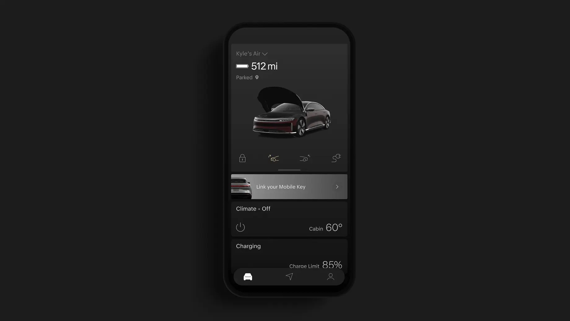 Open the Lucid mobile app and tap the Link your Mobile Key banner on the Home screen.