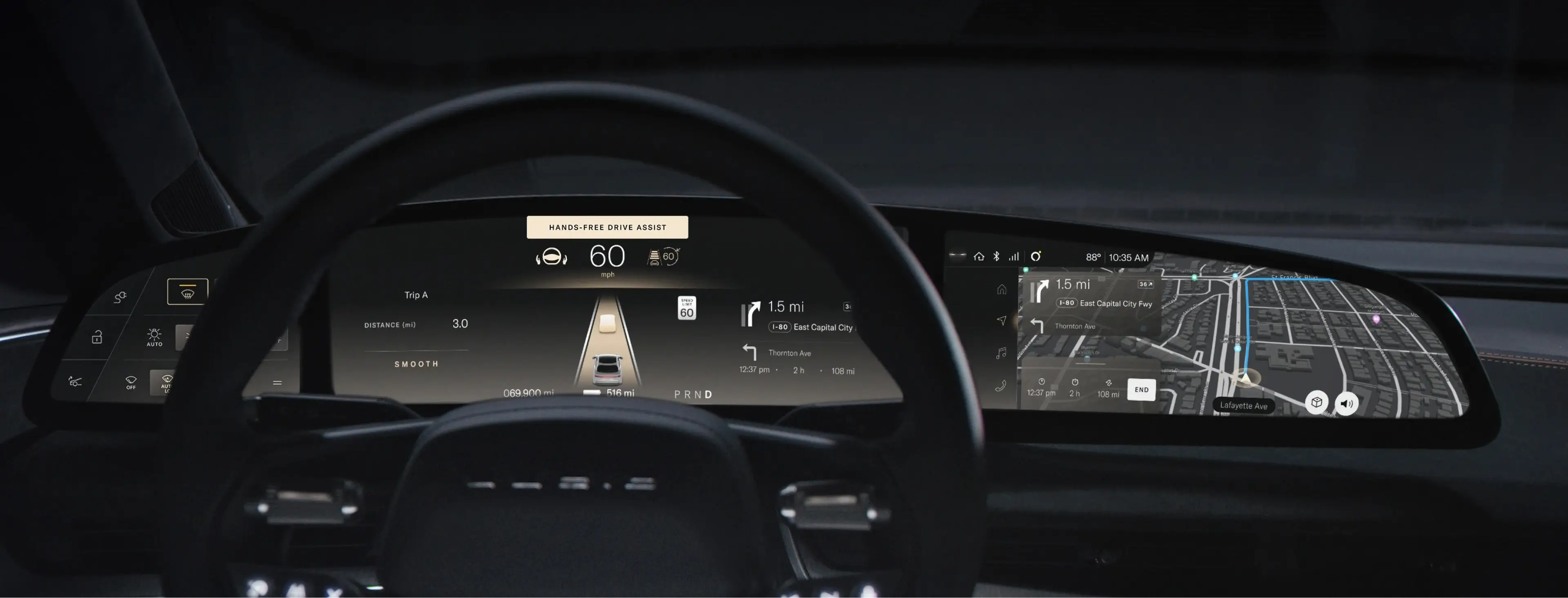 Hands-Free Drive Assist³, formerly Highway Assist, is Lucid’s proprietary Level 2 ADAS technology. It is powered by both software and advanced sensors integrated seamlessly into your vehicle. Hands-Free Drive Assist is a suite of features that work together on certain roads to make Lucid Air even easier and more fun to drive. When available, activate Hands-Free Drive Assist to help you steer and keep your vehicle centered in the driving lane, without touching the steering wheel. It detects forward vehicles in your lane and adjusts your speed to maintain a safe distance, which you can configure using the Following Distance Button. When you want to change lanes, take advantage of Hands-Free Lane Change Assist, which automatically steers your vehicle into the adjacent lane when it is safe to do so after you activate your turn signal. Active Curve Speed Control slows your vehicle automatically when driving in a curve, then resumes your previously set speed, even when hands-free driving isn’t available. If traffic comes to a stop while Hands-Free Drive Assist is active, Extended Stop & Go will automatically resume Drive Assist for you when traffic starts moving again. If lane markings are difficult to detect due to traffic, built-in Traffic Jam Assist lets you use hands-on Drive Assist by following the vehicle in front of you. Hands-free features are reserved for DreamDrive Pro. Drivers must remain alert at all times. If hands-free features are unavailable, hands-on Drive Assist will still be available.