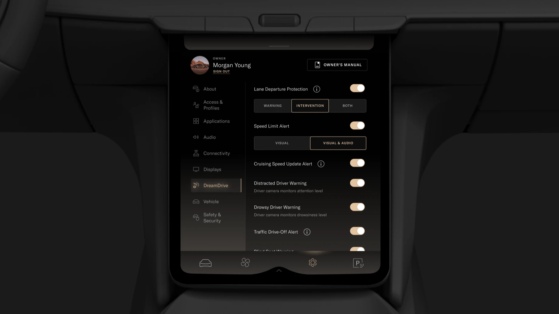 DreamDrive is enabled by a powerful, proprietary ethernet ring with four computer gateways—one in each corner of your vehicle—that communicate at gigabit speed for exceptional reliability and performance. All levels come with a suite of Level 1 ADAS features described on this page, including Adaptive Cruise Control, Auto Park, Lane Departure Protection, and more. All levels also periodically receive over-the-air updates that deliver enhanced capabilities and improvements, so your DreamDrive gets even better over time.